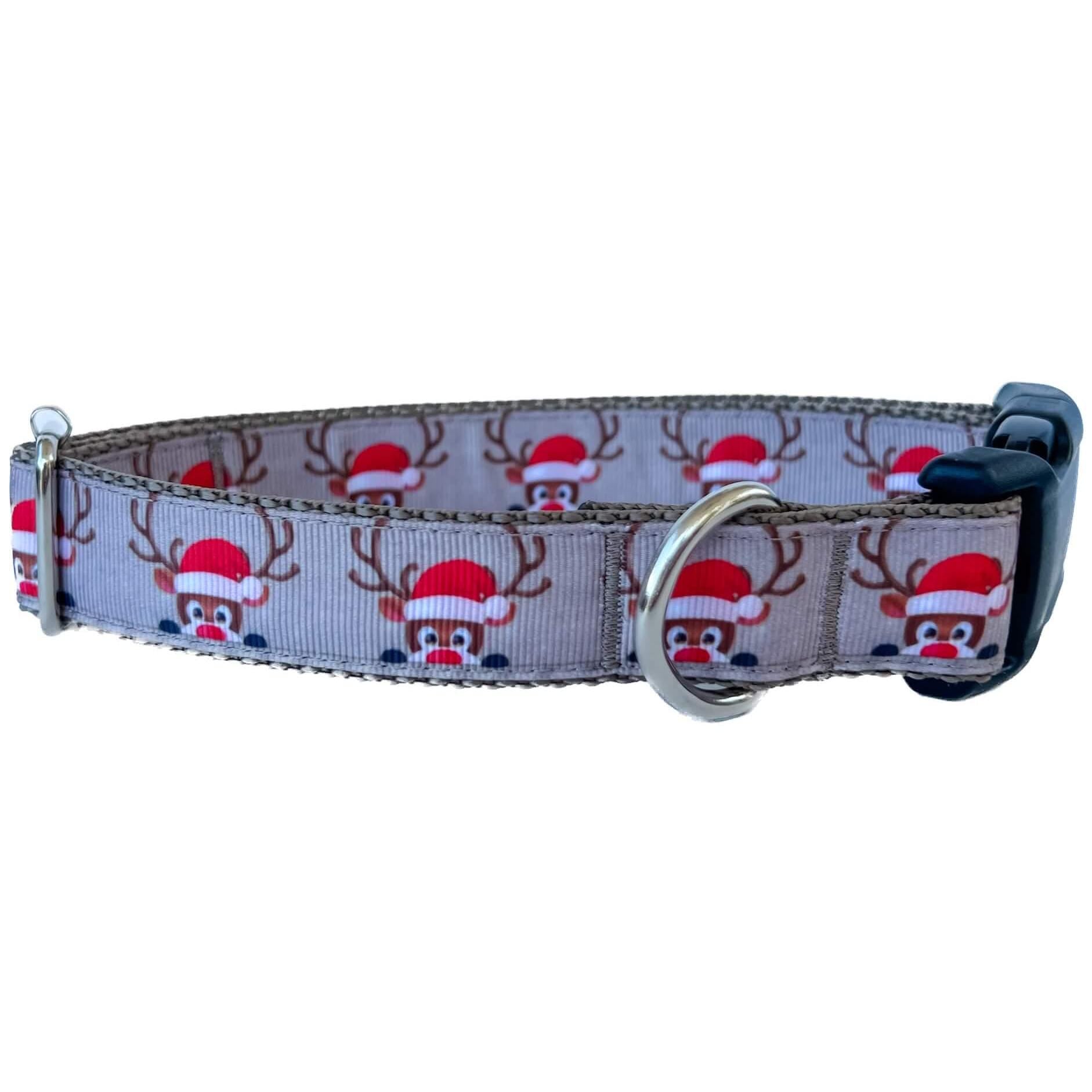 This playful 1" wide collar from Affluent Dogs® features a handcrafted design with Rudolph the red-nosed reindeer peeking out on tan grosgrain ribbon, perfect for holiday cheer!