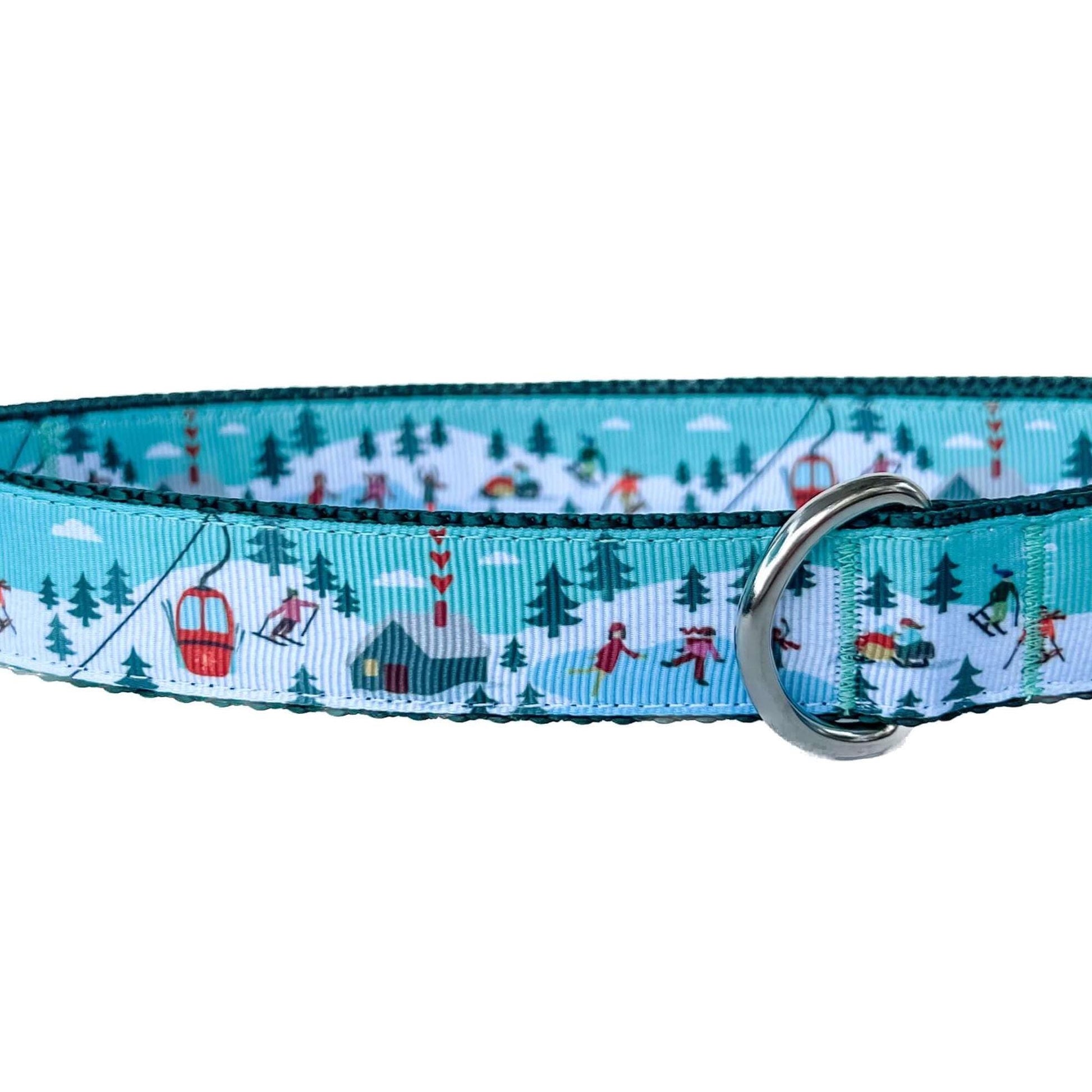 This 1" wide dog collar from Affluent Dogs® is handmade with a charming snowy ski scene grosgrain ribbon—perfect for your pup to join in on the winter fun!