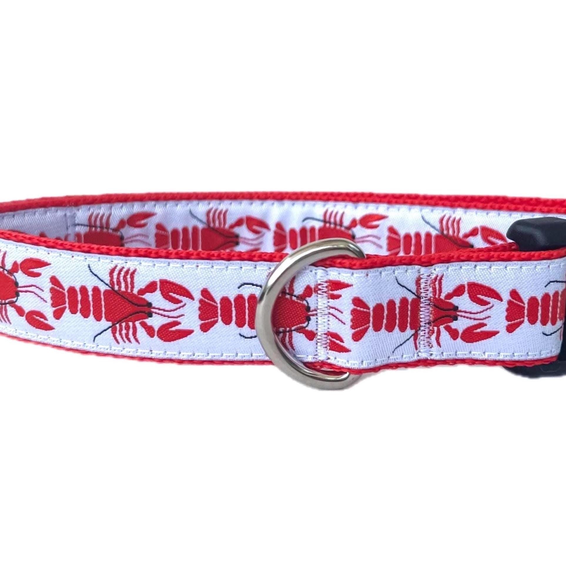 Throw your dog a snappy surprise with Affluent Dogs®'s handmade 1" wide collar, featuring Maine lobsters on a white jacquard ribbon. So fresh!