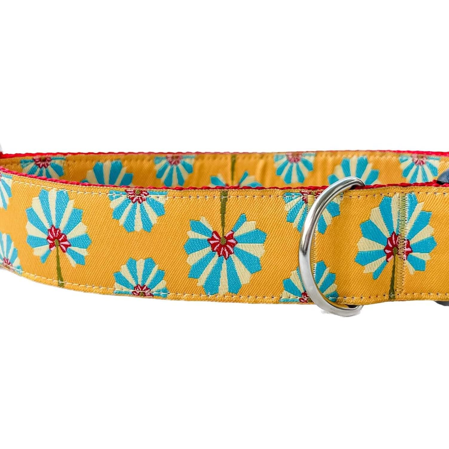 This collar pops! Handmade by Affluent Dogs®, it’s a 1.5" wide collar featuring bright turquoise and lemon palm fans set against a gold jacquard ribbon designed by Kaffe Fassett.