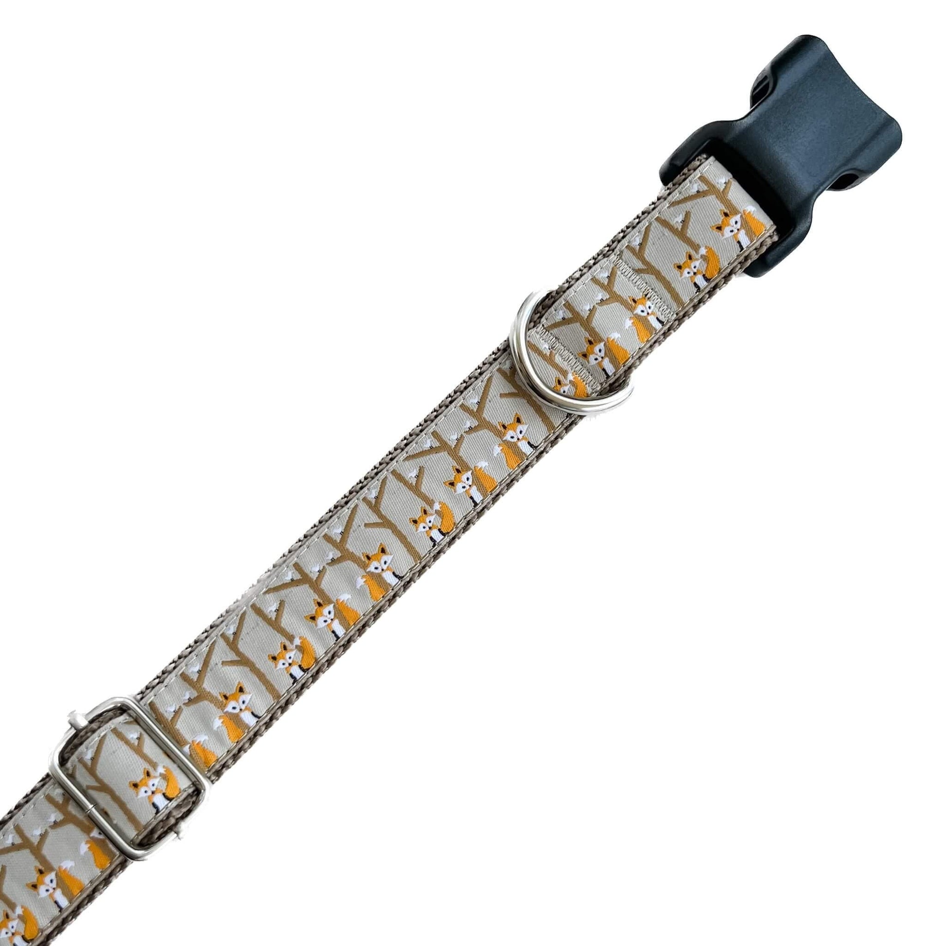 This charming 1" wide dog collar from Affluent Dogs® is handmade and features a playful jacquard ribbon with sneaky foxes peeking out from behind the trees.